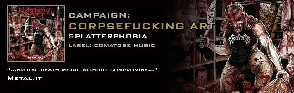 On November 23rd, ably assisted by Comatose Music, Corpsefucking Art will release their latest and greatest concoction of sick humour and sicker riffs � Splatterphobia! Featuring the savage single �Satanic Barbeque�, the precision dissection of �Black Sheep Terror�, the relentless lung puncturing brutality of �Beyond Holy Grounds� and the heaviest version of Cannibal Corpse�s �Staring Through The Eyes Of The Dead� that you�ll ever hear, Splatterphobia is not for the faint of heart or the sound of mind. But if you�re ready to follow the jester, he�ll have you laughing and dancing all the way to your coffin.