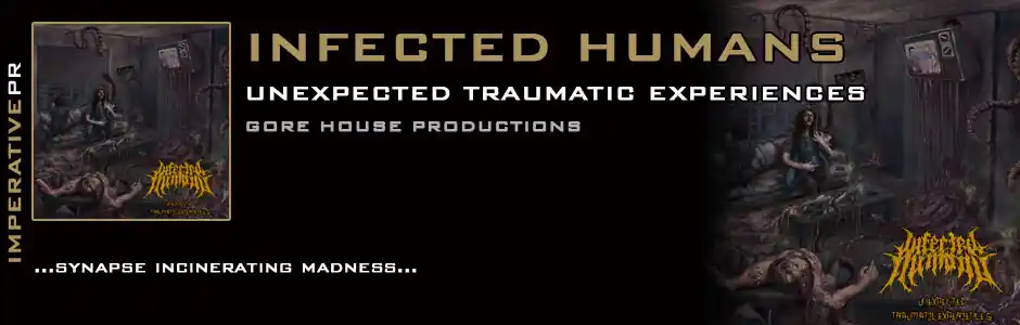 Unexpected Traumatic Experiences features three guest vocal appearances, with Ewan Lambert (Corpseflesh), Sonny Trujillo (Cadaverous Infest) and Pipo Castellanos of Ecuadorian underground heroes Cafeterasub adding their insane influences to this already gloriously demented album. The infamous Gore House Productions will unleash the synapse incinerating madness of Infected Humans on the world on January 15th and the impact will leave us all teetering on a tightrope over the abyss.