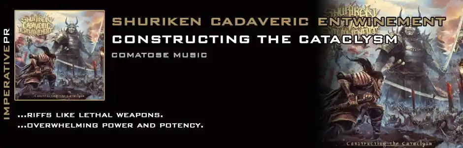 It may have been a long time coming, but Constructing The Cataclysm sees Varela and Barnes return stronger than ever before. When Comatose Music unleash this beast of war on August 5th there will be no denying the overwhelming power and potency of Shuriken Cadaveric Entwinement. Recorded at Audio Helm Studios with Mike Clevenger, Constructing The Cataclysm possesses an incendiary sound that combines clarity of delivery with a snarling, venomous power. The final touch of magic has been applied by Andreas Christanetoff of Armaada Art (Aborted, Kraanium, NecroticGoreBeast etc) with some stunning samurai cover art. Armoured once more in the scales of the serpent god of war, Shuriken Cadaveric Entwinement have returned and the cataclysm is nigh!