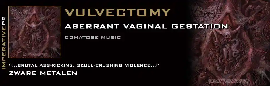 Mixed by Alessio Cattaneo (Corpsefucking Art, Hideous Divinity etc) and mastered by Stefano Morabito (Fleshgod Apocalypse, Vomit The Soul, Hour Of Penance etc) Aberrant Vaginal Gestation sounds as bludgeoning and gore-encrusted as it should, bestial beyond belief. And the cover art by Guang Yang (Beheaded, Nunslaughter, Infant Annihilator etc) is truly a repugnant and grotesque vision, spawned from night terrors and wickedness. There is not a trace of decency to found in any part of this vicious abomination of an album. When Comatose Music unleash the reborn Vulvectomy on April 11th there will be hell to pay…