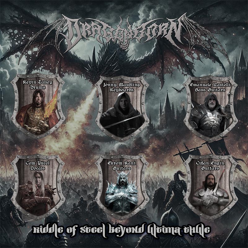 Dragonborn were conceived in Turkey in 2024 by experienced musicians, guitarist Ekrem Kani and vocalist Cem Yücel who had worked together in previous projects and had ambitious dreams for a band like no other; a band that created an entire fantasy realm within which to play out their magnificent sagas of triumph and agony, a band that conjured up music that would excite and amaze, captivate and enthral, transporting listeners away from the everyday struggles of mundane existence. Only the finest musicians would suffice for their vision of Dragonborn, so their search began for true warrior heroes of metal renown. Fellow Turkish musician, guitarist Cihan Engin from black/death metallers Ravenwoods was drawn to the Dragonborn banner, along with Italian bassist Emanuele Rastelli from the darkly dreaming Crown Of Autumn…the line-up was nearly complete. Keyboards would play an essential part in the atmospheric, immersive and epic sound of Dragonborn so who better to work with than Jonny Maudling, previously with Battle Magic masters Bal Sagoth and a contributor to albums by My Dying Bride, Elvenking and Keep Of Kalessin? On the drums, only the heaviest would do for Dragonborn’s songs of battle and warfare, so they turned to the internationally respected Kevin Talley – a man who has recorded albums with the likes of Dying Fetus, Misery Index and Six Feet Under, performed live with Hate Eternal, Suffocation and The Black Dahlia Murder and even auditioned for the legendary Slayer! The brotherhood of knights was complete.